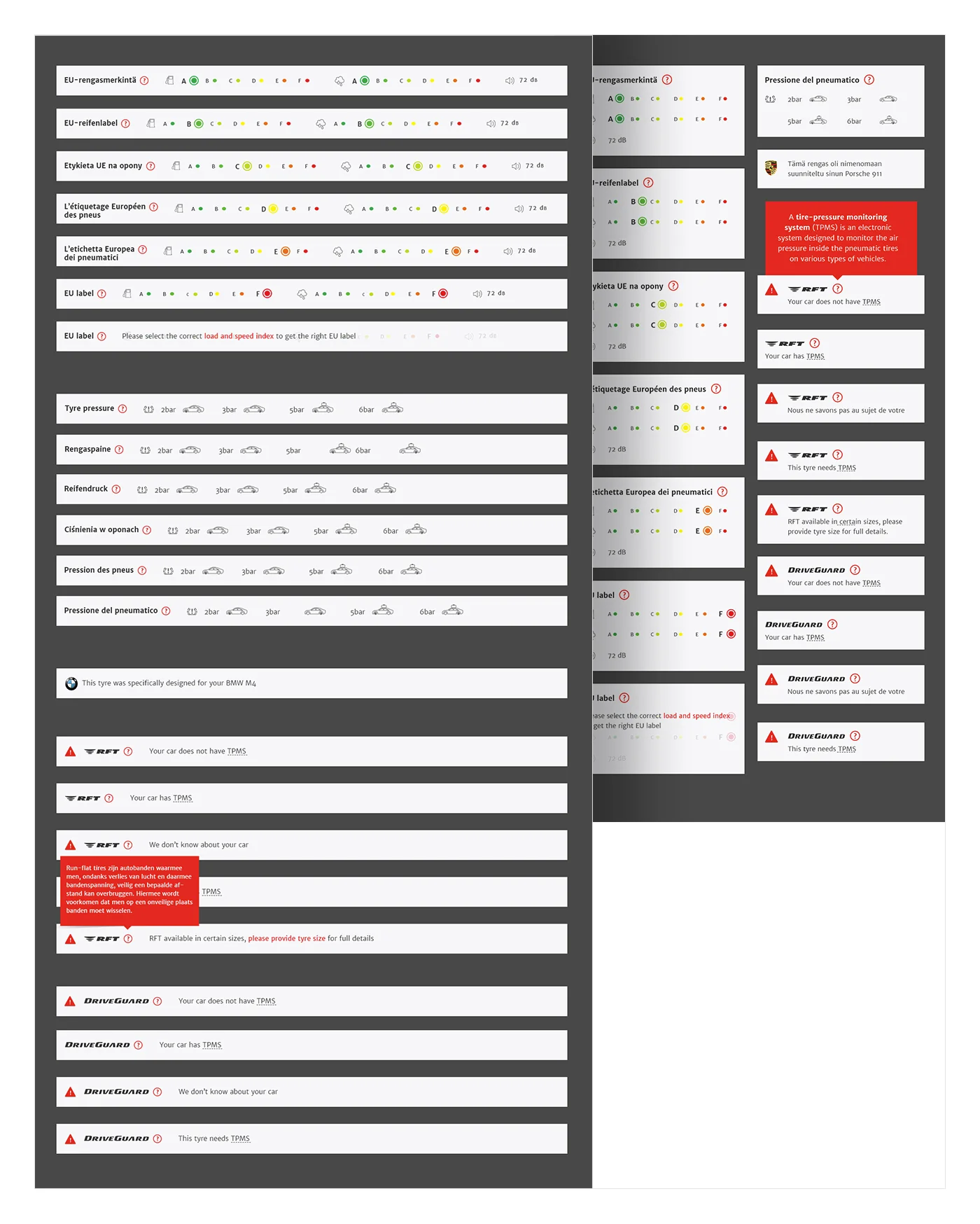 - Include options to select tyres for cars with different front and rear size, weather situations, Run Flat Tyres,..